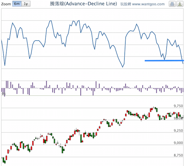 到騰落指標頁 http://www.wantgoo.com/stock2/ADL/ ,你會看到騰落指標已經領先大盤破底。