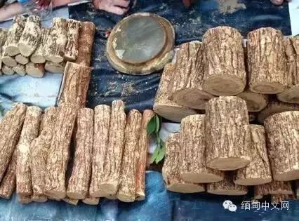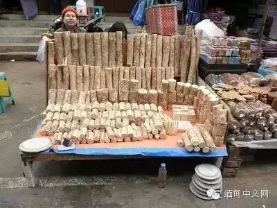 仰光集市上或商店里,随处可见一节一节的黄香楝树干,也有一盒一盒已经研磨成干粉的“德纳卡”出售。