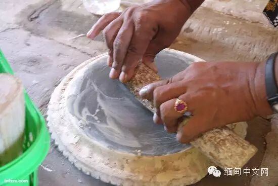 当地几乎家家都有一个像碗那么大小的石磨,这就是用来制做“德纳卡”的。早上起来,洗漱完后,人们先朝小石磨上倒几滴清水,接着把晾干的黄香楝树干置于石磨上面不停地研磨。磨出来的浆汁,就会流入小磨盘边上小槽内。然后,用小刷子把“特纳卡”刷在脸上,有的则是用手直接在两边脸颊上均匀地抹上一片。