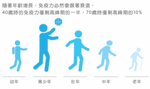 人體的免疫力會隨著年齡的增加而遞減,於二十歲時達到高峰,四十歲時的免疫力僅剩高峰期的一半,七十歲的免疫力僅剩高峰期的10%,免疫復原能力會隨年齡的增長而轉弱。