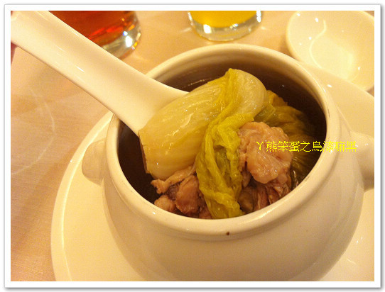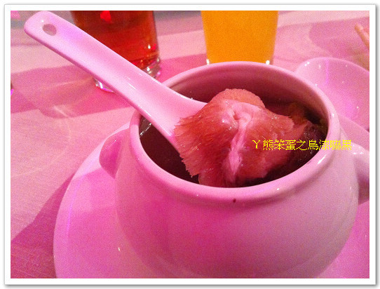 一人一盅的湯,裡面有魚翅、雞肉、大白菜、香菇跟竹笙,湯頭超讚的,但用魚翅好像不太環保。