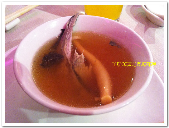 烏骨雞加了菇類及草本藥材熬煮而成的,特別交代服務生,只要給我湯就好了,這個湯也很好喝,跟前面的魚翅湯味道完全不一樣,烏骨雞的湯比較清甜。