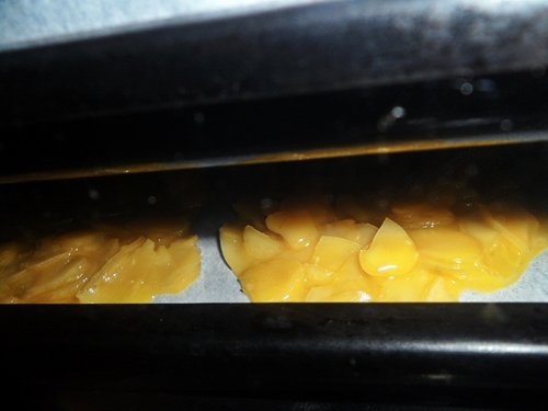 在烤盤上,鋪烤蠟紙,倒入杏仁薄片料糊,稍微刮平,上面再覆蓋蠟紙,再稍微壓扁,愈扁愈薄,入烤箱稍烤一些時間,撕掉上層,再烤脆」!
