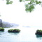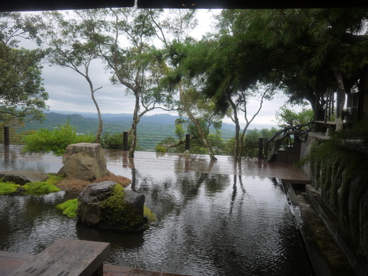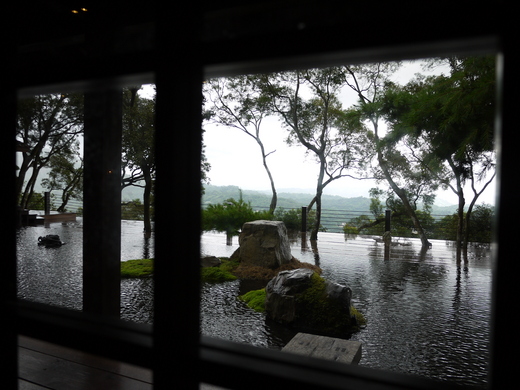 蜿蜒的石階往上,一入眼簾的是很日式的兩層木建築,一片片小格窗,從屋內望向窗外,一大片湖面,雨剛下,風吹起,波光粼粼,很美,很有意境。一下午,時而風大雨大,時而風平寂靜,在傳統風味的日式建築房子裡,頗能享受靜謐。