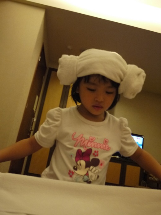 另外,還有一件有趣的事情,就是用毛巾打了羊角頭包在頭上。羊角頭,這幾年在韓劇中很夯,特別是韓國人會去三溫暖或澡堂洗澡,穿那裡的寬鬆衣服、敲著水煮蛋吃外,最最明顯的就是用毛巾綁成羊角頭,以下簡介作法說明,真的很簡單,連五歲的小娃兒都會做,有機會倒是可以試試!!