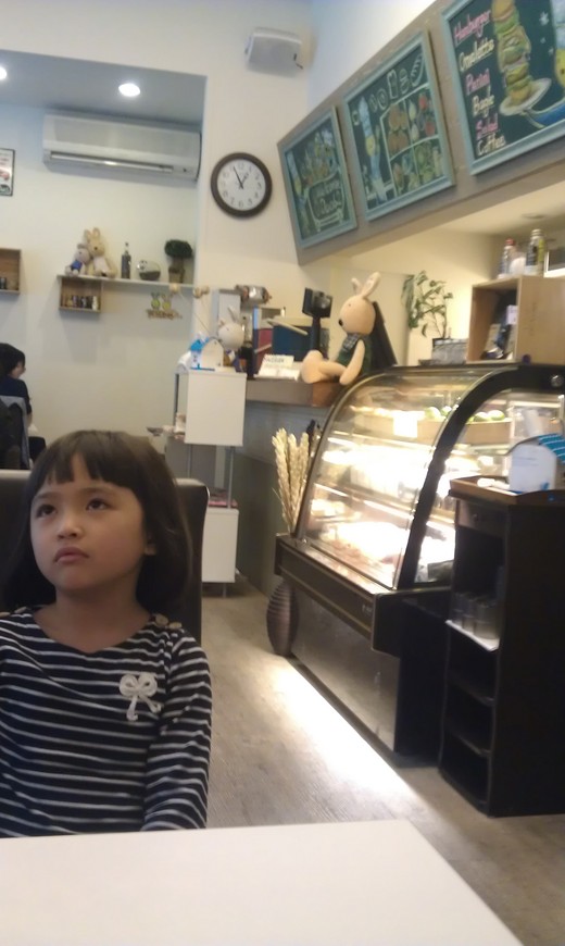 兔子真的又多又可愛,有開飛機的在空中的,有坐在書架上的,有在櫃台或小小一隻散落在各桌上當成桌牌的,完完全全攻陷了年輕女生的心,此起彼落的是"卡哇伊"的驚呼聲與相機喀擦的聲響...........