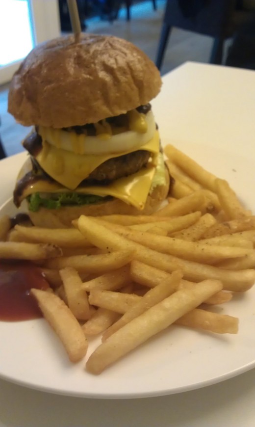 一邊看菜單圖片一邊想著要先點什麼,不自覺的左看右看,發現大家都點了漢堡類的餐點,然後漢堡旁的薯條粗粗的樣子看起來很可口,所以,我們一共點了三個主餐(BBQ雙起司牛肉堡、墨西哥辣牛肉蛋捲、喀拉雞沙拉等),附餐飲料是冰咖啡跟果汁。
