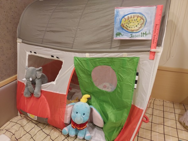這個帳篷就像是家裡的小城堡,我們做了一個寫著Jason & Mark的旗子插在上面。但是插旗沒有用,媽咪已經對我們下最後通牒,說這個帳篷準備要丟掉了,不能佔據床上,家裡也沒地方可以收藏了。我們打算何時要跟小象們在帳篷裡過最後一夜呢?