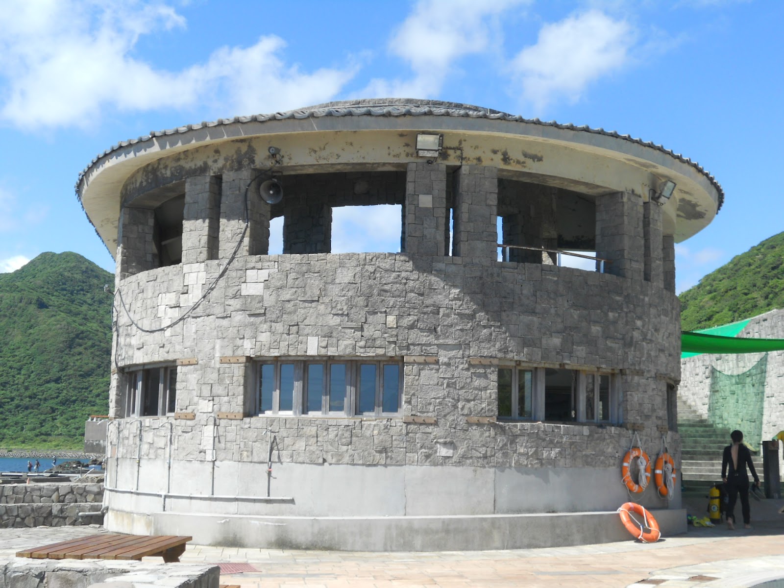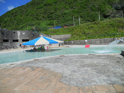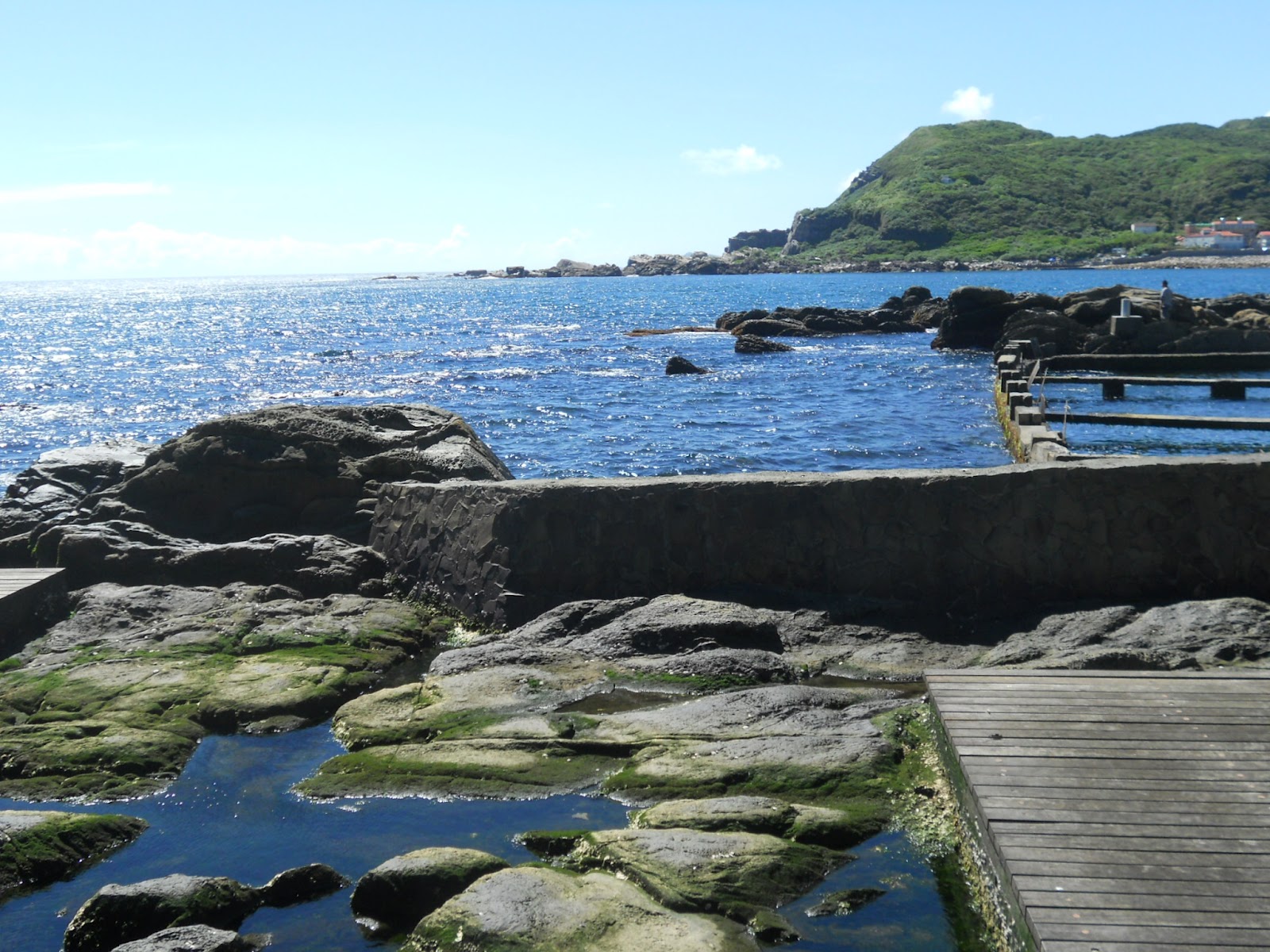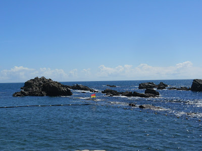 海是美麗的深藍色,幾塊大岩石嚴肅的聳立在海上,雖然太陽赤炎炎的威脅著 可是我們的興致卻絲毫不減