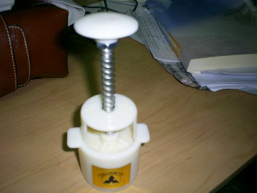2 取皮25克包入豆沙餡後,用塑膠壓模輕輕往下一壓,刷上蛋黃液兩次。