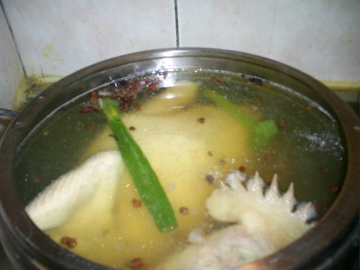 2 煮滾一鍋水,把炒香的八角跟花椒粒放入,也加入兩三片老薑,蔥段、紅辣椒兩支,米酒少量,再把雞放入,蓋上鍋蓋,再次等水滾後5分鐘,即熄火。