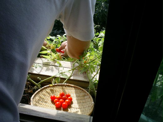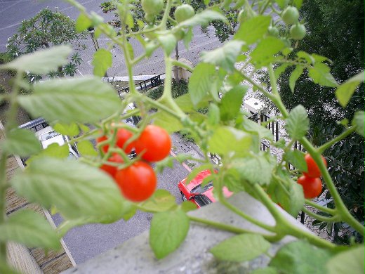 剛開始我看主臥房的陽台日照充足,就隨意把木瓜籽灑在窗台的土壤裡,老公也去買來小番茄的種子,種看看。經過一段時日,木瓜往上伸長,蕃茄卻往下長,我門沒有刻意去注意,所以也沒有插枝固定,就讓番茄根葉四處亂竄甚至往下長,我有時會灑一點有機肥。老公常開玩笑說:木瓜樹往上長,是樓上住戶採;蕃茄往下長是樓下住戶採,我們負責澆水施肥。