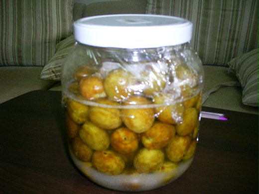 去年醃的梅子還沒吃完。因為去年第一次做,所以捨不得吃完,而且還在試驗中,想看看放到今年會呈現何種狀態?應該變成陳梅了吧?連我家少爺想吃,我還不想拿出來哩。