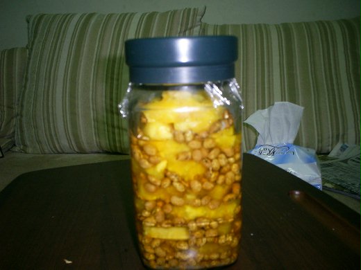 記得小時候,看外婆跟幾位大姨們在我娘家庭院做醬鳳梨。一簍簍的鳳梨堆積如山,大家賣力的削皮,還囑咐著不能沾到水,過程我沒看見怎麼做,只看到好幾罈大罈子,費時ㄧ兩天吧?媽媽把ㄧ罈做好的醬鳳梨擺放在屋子陰暗的一角。到了可以食用時,媽媽就囑咐我要拿不能沾到油水的大調羹和小碗公去盛一碗做菜用。於是我就小心翼翼的把罈口上纏繞了好幾圈的繩子解開,再掀開一層布ㄧ層報紙一層塑膠袋。罈口不大,有時光線不好還要拿手電筒往裡照,才能撈到醃製好的鳳梨醬,如果處理不好,上面還會長白白的菌,媽媽說上面那層菌要先撥到旁邊再撈出已熟成的鳳梨醬來使用。然後還要小心翼翼的回復綁好,這樣一大罈可以食用一兩年呢。