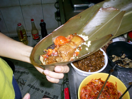 4 取兩片葉子交疊一起,視粽葉大小,我今天的葉子較大,所以先舖2湯匙糯米,依序取適量的油蔥酥、蝦米、香菇、肉塊、鹹蛋黃、糯米,使勁的用葉子包住,繩子綁緊。