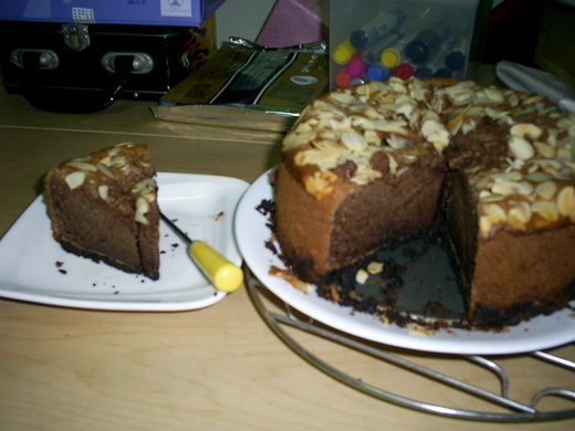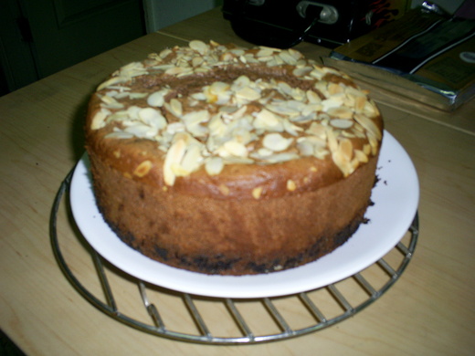5)將麵糊跟打發的蛋白混合均勻後,倒入之前放冷凍庫的餅皮中。上面撒適量的杏仁片即可放入預熱過的烤箱了。烤溫:上火180/下火160 時間:25分