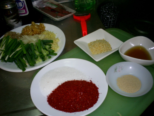 做韓式泡菜需要醃製的材料有:蒜末2大匙、薑末1大匙、蔥段2根、韭菜段5-6根、韓式魚露3大匙、蝦皮1大匙、韓國辣椒粉1/4杯、柴魚精1大匙、蘋果1/4磨成泥、糖4大匙
