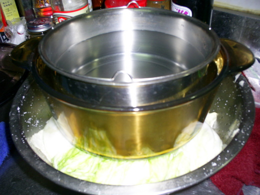 作法: 1. 先將大白菜剖成4份,先用冷開水稍微清洗過稍滴乾水分,再均勻地把每片葉片灑上鹽巴。我做這動作時是在臨睡前做的,也就是需要在白菜上壓重物使之出水,等我一大早醒來,盆子裡的大白菜經過鹽水一晚後,就可以倒掉,然後再用冷開水清洗瀝乾。