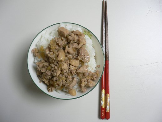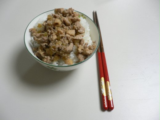 我家先生說六本木有開一家鬍鬚張魯肉飯,要帶我們去回憶一下台灣的味道,可是我一聽說一碗魯肉飯420日元左右,馬上跟他們說媽咪明天煮給你們吃,就這樣做了生平第一次煮的魯肉飯,做法可能不是很道地,全家倒是很捧場;這是第二次做的照片,因為家中有雞腿肉就直接用了,我做菜一向不特別留意材料的量與種類,看冰箱有那些材料可以用就用。