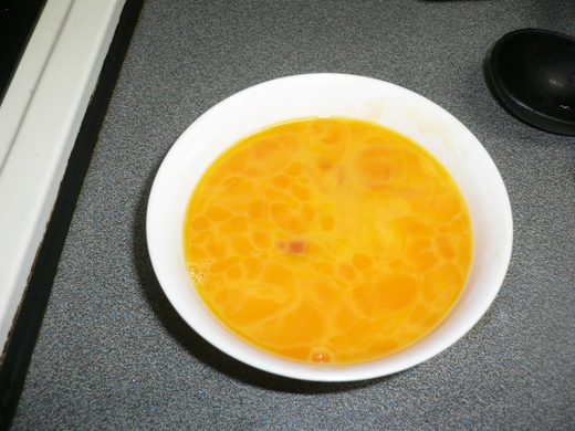 3.再倒入1/3蛋汁,煎熟與前1/3合併。