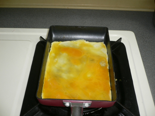 2.熱鍋子加少許油即可,首先倒入1/3蛋汁,煎熟後摺成1/3移置最前面。