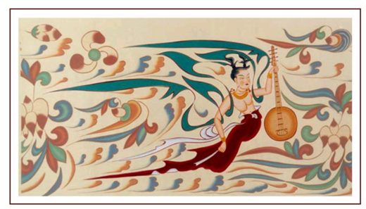 飛天伎樂一詞﹐最早是出現在東魏楊之寫的《洛陽伽藍記》一書中。但在甘肅永靖炳靈寺具有公元420年紀年的第169窟中﹐就已經用美女的形象來表現了﹐也許衹有這樣做﹐中國的佛教徒們才能接受這些印度佛教中的歌舞音樂神。莫高窟的飛天伎樂﹐是與洞窟同時出現的﹐主要是在佛傳﹑本生故事中﹐為表示對佛行善情節的禮讚與歌頌﹐將飛天以散花祝願的形式繪制在畫面上方的虛空中。或是在釋迦牟尼的說法圖中﹐飛天也會以侍從﹑護法的形象出現在空中。
