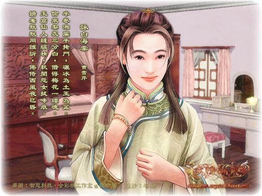 曹雪芹在寫《紅樓夢》的時候,似乎也對這個熟典特別感興趣,所以一而再,再而三地引用套用,反覆渲染。如第五回秦可卿房中掛有唐伯虎的《海棠春睡圖》,十七回,給怡紅院提匾額詩時,一客曰:「『崇光泛彩』方妙。」第十八回,寶玉《怡紅快綠》一詩中有句云,「紅妝夜未眠」,這都是把海棠比做睡美人的例子。但最有趣的是第六十二回「憨湘雲醉臥芍藥珚」地一段精彩描寫。湘雲真的「再花從中地一個石凳子上睡著了,四面芍藥花飛了一身,滿頭臉衣襟上揭示紅香散亂,手中的扇子在地下,也半被落花埋了。一群蜂蝶鬧嚷嚷地圍著她,又用鮫帕包了一包芍藥花瓣枕著。眾人看了又是愛,又是笑,忙上來推喚挽扶。湘雲口內猶作睡語說酒今。….」很明顯,這段香豔文字,雖然說的是「芍藥花」,實際上卻仍是「海棠春睡」典故的翻版。所以第六十三回,湘雲抽到的是一根海棠籤,題著「香夢沉酣」四字,詩云:「只恐夜深花睡去」。黛玉笑道:「『夜深』兩個字,改『石涼』兩個字。」眾人便知她趣白湘雲醉臥的事,都笑了。
