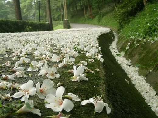 微溼的泥地上 滿是凋零花瓣飄落成的五月雪