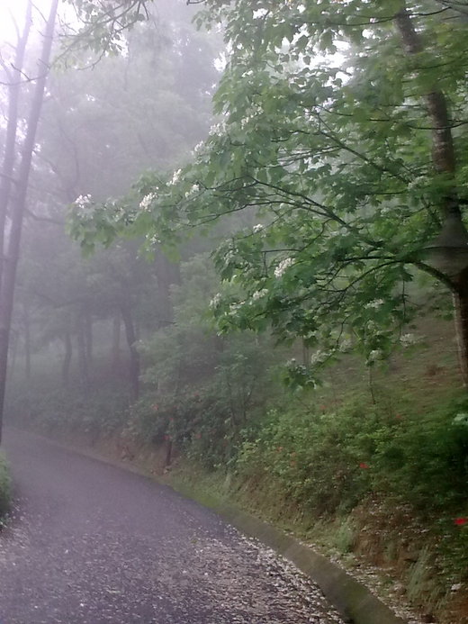 山徑林樹像是裹著灰白的輕紗般 隱約而朦朧