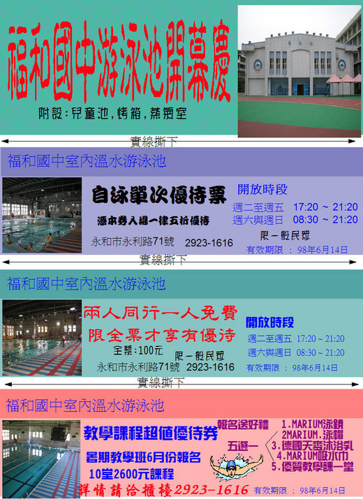 ※為慶祝福和國中室內溫水游泳池開幕,並提倡游泳運動,回饋Marium的游泳資訊網的朋友們,特舉辦游泳優惠活動。
