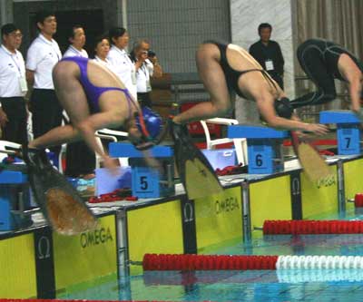 由於腳底如同加裝了渦輪噴射引擎,世界紀錄50公尺只要花14秒83,比起自由式,速度提升30%以上。除高科技材質的巨型單片腳蹼,選手比賽或練習時,還得戴上潛鏡和「水下通氣管」,以便直接在水中呼吸換氣,不時噴水的畫面,與鯨豚頗有異曲同工之妙。
