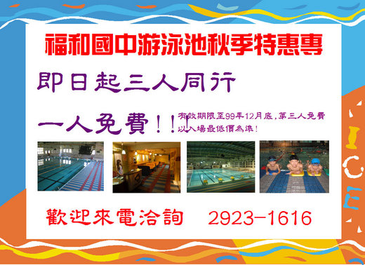 ※為提倡游泳運動,福和國中室內溫水游泳池,特舉辦秋季游泳優惠活動。