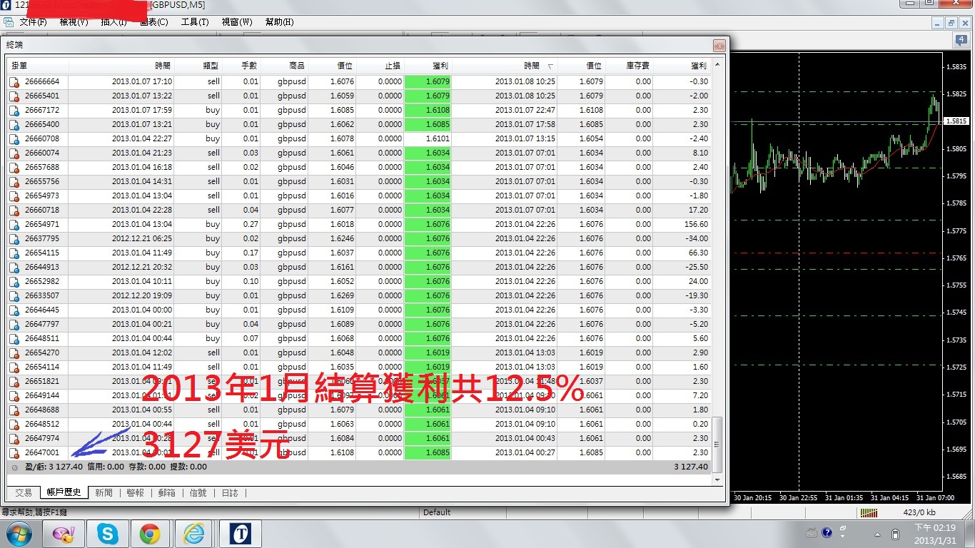 致富種子2013年1月結算獲利共12.5% 3127美元.................期貨.外匯.股票.基金.房地產投資 [ 穩定獲利才是王道!! ]