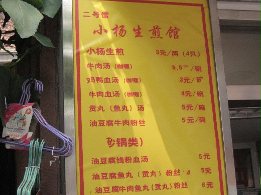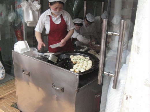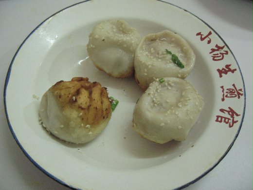 講到上海的小吃就不能不提一提生煎包這種小點心,當然,你要把它當作正餐也是可以的,在上海市名氣最大的生煎包店算是小楊生煎包,它位於吳江路,近南京西路,網路上只要輸入小楊生煎包就有一大堆網友的評論,不過今天就發表一下個人的感想;我覺得要到小楊生煎包吃生煎包及其它麵點或湯,最大問題不在排隊,而在於找位子坐,由於店面不大而且座位有限,所以等位子的時間長過排隊買包子;現在我就來評論一下這小楊生煎包:咬下包子後,裡面的湯汁四溢,嚐起來有些甜味,內餡的味道也相當鮮美,桌上有一個茶壺,裡面裝的是醋而不是茶,這裡的小吃店很少有醬油壺在桌上,可能是食物本身就已經很鹹了,不過對我而言,小楊生煎包最大的敗筆應該是在那個應該香脆焦黃的包子外殼,我吃到的卻是因為油膩而失去香味,最是可惜
