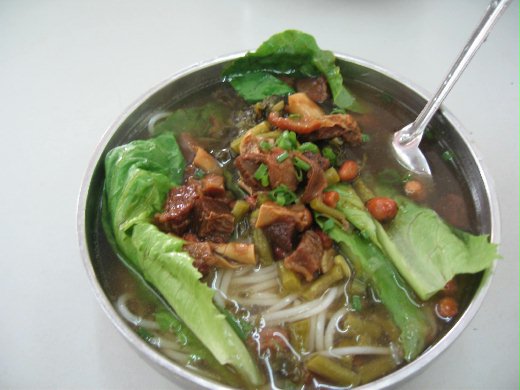 在上海市最常看到的三種當地餐廳分別是福建沙縣餛飩,蘭州牛肉拉麵及桂林米粉,今天4/26中午就在路上找了一家桂林米粉來吃看看,其實就我所知道收入比較好一點的當地人都不會到上述三家連鎖餐廳去吃,主要是因為環境衛生情況蠻差的,而且去吃的人大部份可能是民工或是工人,因為吃飽也只要5-7元而已,回過頭來說說這桂林米粉的味道,其實雖然叫米粉,我覺得就是台灣的米苔目,我叫的是牛腩米粉,吃起來倒是有點像泡麵的感覺,圖片中的牛腩有點像是泡麵泡開的牛肉塊一樣,整個評語是雖然便宜但是不好吃