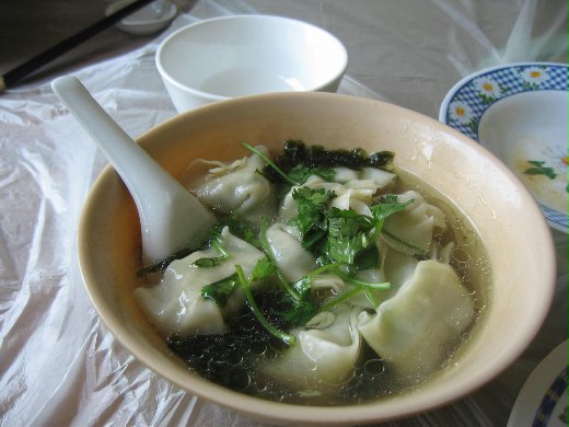 羊肉鍋貼及牛肉水餃及牛肉餛飩都端上桌,其中羊肉鍋貼其實就是把餃子拿去煎而已,吃起來是沒有騷味,而且味道也不錯,只是油了一點,牛肉水餃則是餡還算飽滿可是也談不上非常好吃,只是在中等位置,比較糟糕的是那個餛飩,問題是出在那裡呢?第一,它的皮非常薄,一吃就知道是機器做的皮,比不上鍋貼及水餃的手工質感,第二是一咬下去,就會直接感覺到內餡少得可以,好像小孩穿大衣的感覺,讓我覺得還比不上路邊常吃的菜肉大餛飩的實在