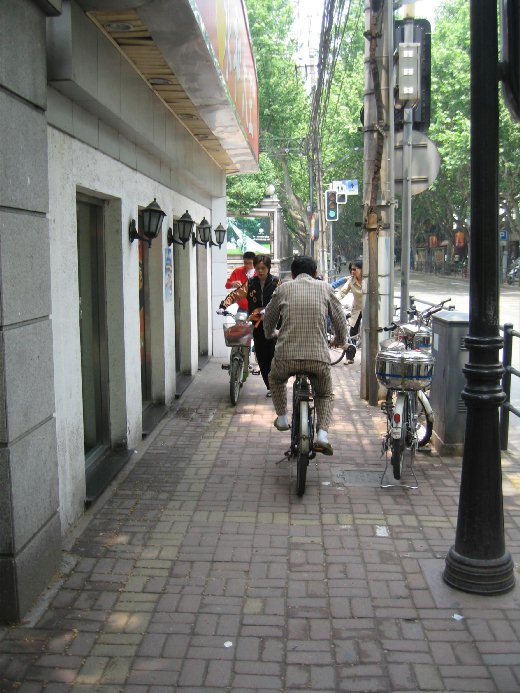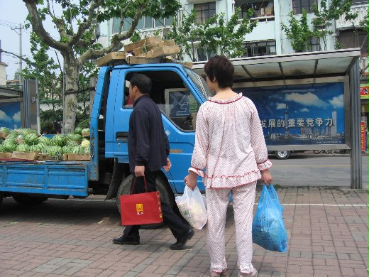 上海市雖說是個正在蛻變中的現代化國際城市,不過在進步之中總是會出現一些讓人驚奇的景像,我分別在徐匯區南部的四號地鐵線大木橋站門口及徐匯區中部靠近蘆灣區的瑞金二路上捕捉到難得的奇景;第一張照片是一位女士全身完整地穿著一件睡衣,手上拿著剛在市場買到的食材正在馬路邊上招著計程車,在照完相片後,這位女士竟然走下人行道,站在接近馬路的中間處上車,令人咋舌;第二張照片是一位年約五十的中年男士,幾乖幾乖地騎著自行車,在狹窄的瑞金二路靠近外國觀光客雲集的瑞金賓館處的人行道上從我的身後騎過去,悠哉悠哉的樣子讓我不禁覺得上海是個充滿驚奇的地方
