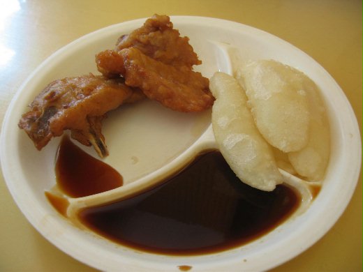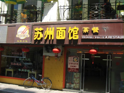 這天來到上海市最繁華的大街:南京東路,這天天氣極熱,頭都快暈了,正當中午時分,人潮還是很多,吃過沈大成的青糰與金糰,感覺青糰的確像是台灣的艾草糕,吃來像是吃沒煮熟的湯圓,是有些不習慣,至於金糰就比較好,金糰是以黃豆粉為底,內容則是豆沙餡,算是口感比較好的,不過兩者都比不上台灣那種在路邊攤有滴兜滴兜聲響的麻糬;午餐時間是在南京東路上鬧區巷子裡的蘇州麵館中,這家麵館的價錢在昂貴的鬧區中是相當實惠的,所以有蠻多人光顧,我吃的是大排麵,也就是台灣的排骨麵,原則上我在這裡吃過兩三家大排麵,可是吃起來並不是太好吃,這家蘇州麵館也不例外,另外同行友人則是叫了這家的招牌麵食:排骨年糕,乍聽之下,排骨跟年糕怎麼弄在一起?其實本地人把年糕也當做是一項主食來吃,不過端上來後,看起來賣相實在不怎樣,友人賞了一個年糕給我嚐,沾上醬料吃,也實在是吃不出多好的滋味,也許因為一開始我對這項麵點就沒有太大興趣的緣故吧!