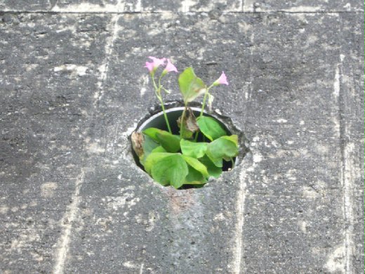發現幾朵野花從水管裡冒出來