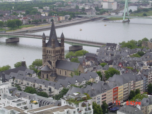 於機長的廣播中醒來,終於抵達了飛行了13小時40分的德國法蘭克福機場,搭乘ICE來到了萊茵河盼最大的城市,並擠身德國第四大城的科隆市(Koln).羅馬人所建立的科隆市,堪稱為德國最古老的城市之一,已有2000年的發展歷史,於二次大戰中,科隆市貌95%幾乎毀損殆盡,科隆大教堂(Dom)於聯軍刻意保存下,才免於戰火的催殘.