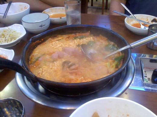 士兵出征前,要爭取到吃飽而且能夠讓部隊快速的出發,作法為:將所有的醬料和食物倒入鮮紅的辣湯中,一併烹煮,有點與吃火鍋的方式雷同,韓國當地取名為戰鼓,可以將鮮紅的辣湯加入白飯中一併食用,或加入韓國有名的泡麵”辛”,吃完後,鐵定可以穿越北緯38度線並打一場漂亮的勝戰-小白球(哈哈)….三人同行價格比韓國烤肉B&Q便宜許多,價格約為WOW 40,000-