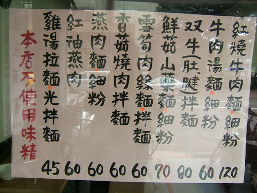 頭一回看到窗戶上大大的麵單,直覺的反應是,這是哪門子的店,甚麼麵都賣?不過,只要標榜不加味精,永遠能吸引我多看兩眼。嗯,直直的店面頗為潔淨,桌椅前後陣列左右切齊,桌面小到媲美巴黎街頭的咖啡館,桌上更連一個瓶罐也無,再加上門口那張本店無廁所的告示,對,即使是滿座的客人,流動率應該也不低,正適合中午吃麵。