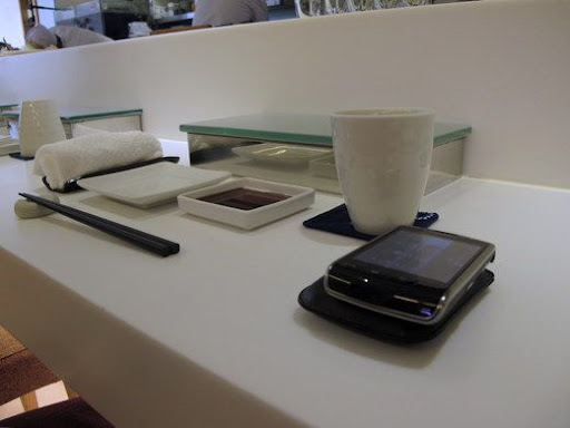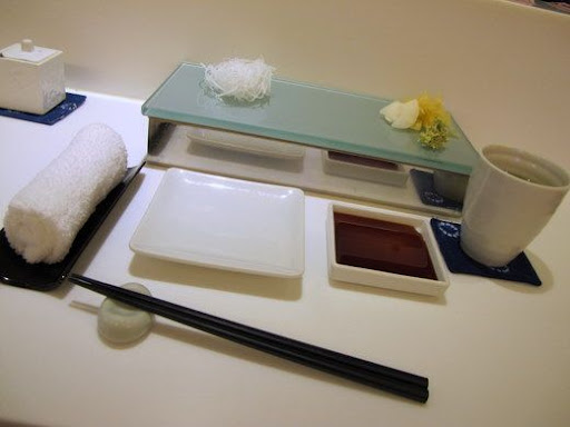 吃中式料理,沒人傻到指名在爐旁灶邊用餐,大火大油鏗鏗鏘鏘地翻弄上桌,熱騰騰地讓您吃著高興,可煙繚火繞的還沒走出店門就滿身臭不可聞。日式壽司正好相反,不但素雅潔淨,廚師舉手投足還帶表演性質,間或還能與客人談笑兩句,就衝這,誰不想選最佳席位?