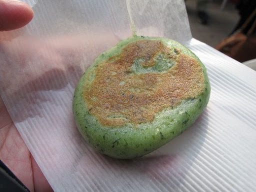熱呼呼的艾草麻糬,兩面微炙,透著誘人而不膩口的油香,一口咬下,充盈著馥郁的艾草香,裡頭裹著一點也不死甜的紅豆餡兒,在這風寒裡,真是幸福無比!![]()