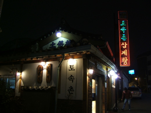 院子裡都是木造的房間,撿了間有椅子的,雖嫌不夠韓,可免去盤腿席坐之苦。土俗村與咸興麵屋有著同一種調性,獨沽一味,以蔘雞湯為有名於世,聽說韓國總統也常為座上客,此外只兼賣烤雞而已。