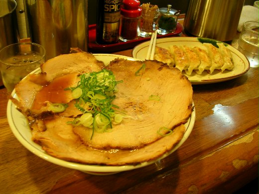 我和太太點了一碗叉燒拉麵和煎餃子,端上桌之後簡直不敢相信自己的眼睛:完全看不到麵條,滿滿的叉燒把碗給覆蓋了!本以為湯頭會很鹹,可是意外的卻非常清爽,中直麵把清爽的熱湯帶進嘴裡,一點都不燙,但是入胃之後可以感受到溫暖,讓人想把整碗湯都喝完,煎餃更是超優,油而不膩,同樣是日本人所謂的「逸品」。