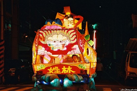 今年的主普姓氏---郭姓打陣頭,其他輪祭姓氏依序在後,隊伍中尚有不同主題的燈車和各式陣頭,顯得氣勢浩大、熱鬧非凡呢。(在燈車上有以紙厝外型-即代表宗氏祠堂,水燈在施放之前,須先置於車上繞境遊街,接受善男信女的祈願。然施放時,水燈內會置放經衣與紙錢,招引同姓孤魂歸其所,並庇佑全家大小平安、事事興旺。水燈漂得愈遠表示施放水燈的人來年福氣愈旺。)