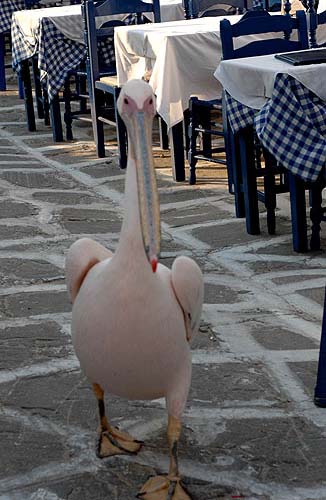 逛大街的鵜鶘鳥是Mykonos的福神,這個有著與傳說中的送子鳥一樣的長嘴巴,但是它既不替人送信也不替人送孩子,而是用餐時間一到就準時站在著名的Nikos餐廳廚房門口,等著廚房內的食物出現,這是動物向人類勒索保護費嗎?其實說起來也是蠻合理的,觀光客要看島上僅存的四隻鵜鶘鳥,還一定得要到Nikos餐廳走一遭哩。