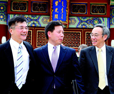 Chris Lu, Cabinet Secretary for the President, flanked by Gary Locke (left), Secretary of Commerce, and Steven Chu, Secretary of Energy, are leaving Zhong-Nan-Hai, adjacent to the Forbidden City in Beijing. The Chinese American trio, ranking officials in the Barack Obama Administration, just finished their meeting with Premier Wen Jia-Bao in the administration headquarters of the Chinese Central Government.(丁譯)