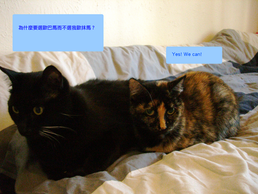 唯一的競選總幹事Kelly表示:對於吃貓食,Yes, we can! 日前有人將「歐抹馬」的名字誤植為「貓巴馬」,敗選後,歐抹馬將改回原來本名Opie。貓怎麼會巴著馬不放呢?希望大家能多加參與這個正名。
